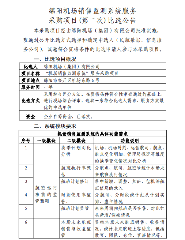綿陽機場銷售監(jiān)測系統(tǒng)服務(wù)采購項目(第二次)比選公告